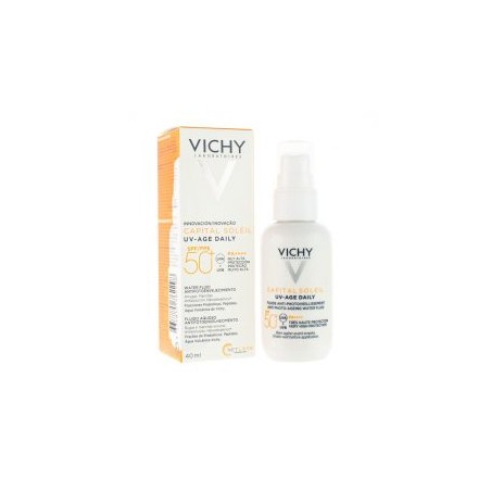 Vichy Capital Soleil UV-Age Daily Fluido SPF50+ 40 ml es un fotoprotector facial ultraligero que ayuda a prevenir y tratar los signos del fotoenvejecimiento. Ideal para personas preocupadas por arrugas, manchas y pérdida de firmeza, este protector solar de amplio espectro está diseñado para ofrecer una protección diaria avanzada y cuidar todo tipo de piel, incluso la más sensible.