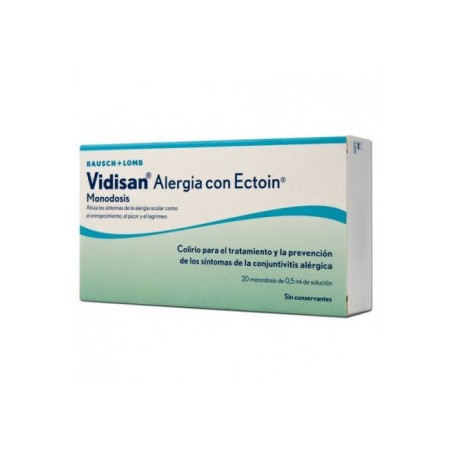 Vidisan Alergia Ectoin Colirio 20 Monodosis es un colirio en formato monodosis indicado para el alivio y prevención de los síntomas de la conjuntivitis alérgica, como picor, enrojecimiento, irritación y lagrimeo ocular. Especialmente diseñado para adultos y niños que buscan una hidratación ocular eficaz, su uso es ideal en casos de alergias, ojos secos o expuestos a factores externos como luz artificial o aire acondicionado.