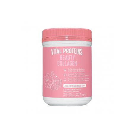 Vital Proteins Beauty Fresa Limón 271 g es un complemento alimenticio en polvo, formulado para ayudar a mejorar la salud y el aspecto de la piel, cabello y uñas. Gracias a su contenido de péptidos de colágeno hidrolizado, ácido hialurónico, biotina y extractos naturales de frutas, este producto está especialmente indicado para adultos que buscan potenciar la firmeza y elasticidad cutánea, fortalecer el cabello y cuidar sus uñas de manera sencilla y natural.