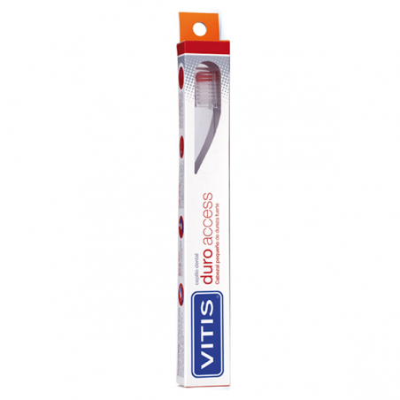 VITIS CEPILLO ACCESS DURO es un cepillo dental especialmente diseñado para la higiene diaria de personas con bocas pequeñas y zonas de acceso complicado, como adolescentes, adultos con arcadas reducidas y niños en transición a cepillos adultos. Este cepillo facilita la limpieza eficaz en espacios difíciles, aportando comodidad y protección durante el cepillado.