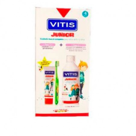 Vitis Junior Pack Promocional está indicado para el cuidado bucodental infantil y no presenta contraindicaciones específicas; sin embargo, se recomienda su uso en niños mayores de 6 años bajo supervisión adulta para evitar la ingestión accidental del colutorio. Ante cualquier duda, consulta a un profesional de la salud bucodental.