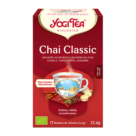 YOGI TEA CLASSIC ORIGINAL es una infusión ayurvédica en formato de bolsitas, elaborada con una exquisita mezcla de especias ecológicas como canela, cardamomo, jengibre, clavo y pimienta negra. Este producto está pensado para quienes buscan una experiencia reconfortante, inspirada en la tradición y el bienestar integral, siendo ideal tanto para practicantes de yoga como para cualquier persona que desee disfrutar de una infusión saludable, aromática y revitalizante.