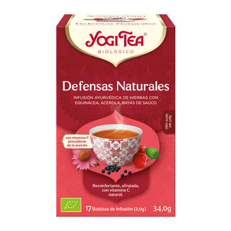 YOGI TEA DEFENS NATU 17FILT X2G YOGI TEA es una infusión ecológica especialmente formulada para reforzar las defensas naturales del organismo. Esta infusión, a base de acerola, equinácea y una cuidada selección de especias y plantas, está diseñada para personas que buscan cuidar y fortalecer su sistema inmunológico de manera natural. Es ideal para toda la familia, incluidos los niños, como complemento a un estilo de vida saludable.