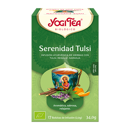 YOGI TEA SERENIDAD TULSI 17 BOLSITAS 2G es una infusión ecológica que combina la afamada Tulsi o "Albahaca Sagrada" con una cuidada selección de hierbas ayurvédicas y especias. Diseñada para personas que buscan un momento de calma y equilibrio durante el día, esta tisana está especialmente indicada para quienes desean relajarse de forma natural y saludable.