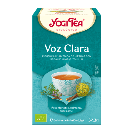 YOGI TEA VOZ CLARA-BIO es una infusión de hierbas ayurvédicas ecológicas especialmente formulada para cuidar y proteger la garganta. Esta mezcla natural, dirigida a adultos y niños que deseen mantener la voz clara y saludable, combina regaliz, hinojo y tomillo para aportar alivio, suavidad y sabor intenso. Ideal para quienes buscan un remedio herbal eficaz y ecológico para calmar irritaciones de garganta y disfrutar de una bebida reconfortante.